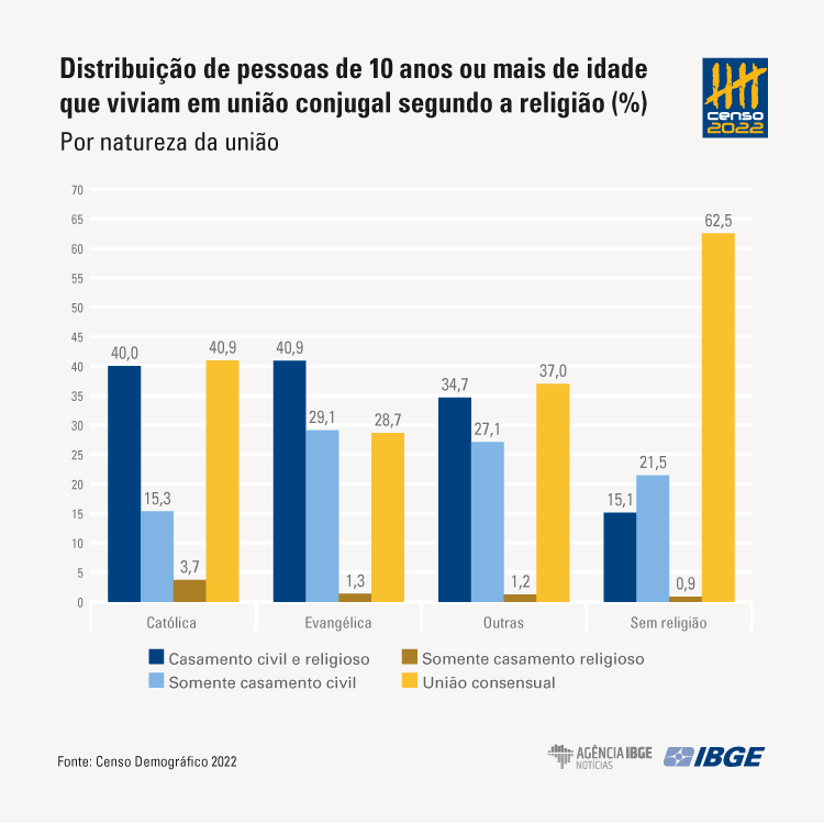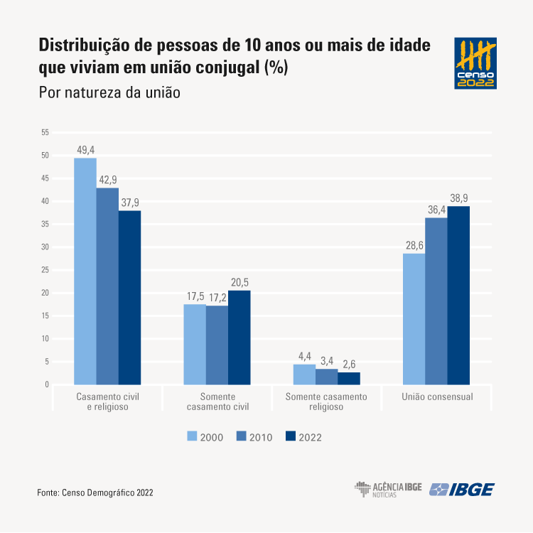 Em 2022, mais da metade (51,3%) da população de 10 anos ou mais do país vivia em união conjugal, o que representa 90,3 milhões pessoas. Pela primeira vez, o tipo de união mais frequente foi a união consensual (38,9%), que ultrapassou o casamento civil e religioso (37,9%). Em relação a 2000, houve crescimento dos casamentos somente no civil e das uniões consensuais. Por outro lado, caíram os percentuais das pessoas unidas pelo casamento civil e religioso (de 49,4% em 2000 para 37,9% em 2022) e unidas apenas no religioso (de 4,4% para 2,6%).