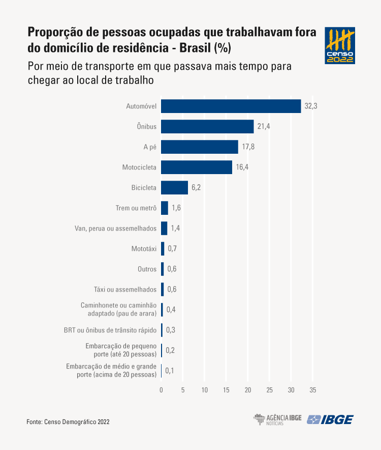 O Censo 2022, de modo inédito, investigou o meio de transporte que a população do Brasil passa mais tempo no deslocamento para o trabalho. A pesquisa revela que há um predomínio do uso de automóvel (32,3%), ônibus (21,4%) e motocicleta (16,4%), além da locomoção a pé (17,8%), como meios de transporte, representando 87,9% do deslocamento para trabalho no país. Em valores absolutos, 48,9 milhões de pessoas usam esses meios de transporte motorizados: 22,6 milhões de pessoas, o automóvel; 14,9 milhões, o ônibus; e 11,4 milhões, a motocicleta. “Tal cenário reflete o histórico do país em privilegiar rodovias para a integração das cidades e regiões, além do descompasso entre crescimento urbano e oferta de transporte público”, afirma Mauro.