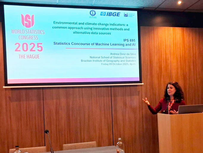 Andrea Diniz da Silva, Chefe de Relações Internacionais do IBGE e professora da Escola Nacional de Ciências Estatísticas, apresentou o projeto “Indicadores ambientais e de mudanças climáticas: uma abordagem comum utilizando métodos inovadores e fontes de dados alternativas”, coordenado pelo IBGE e desenvolvido em parceria com 11 países da América Latina e Caribe.
