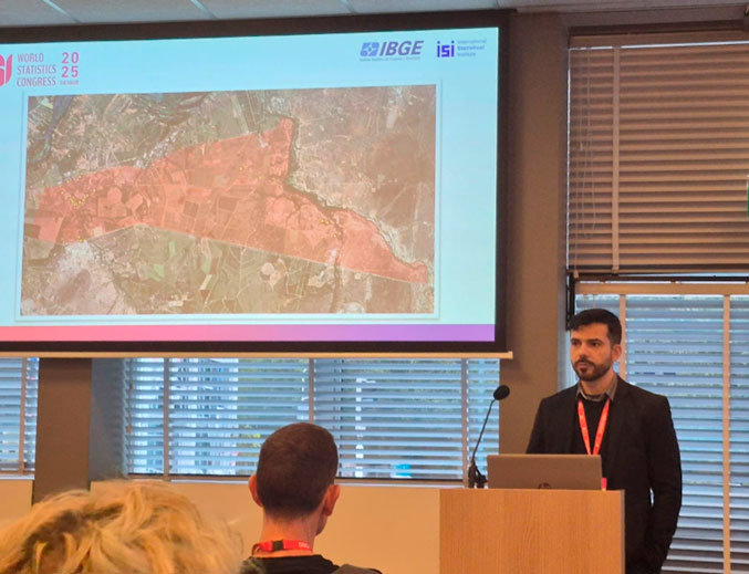 O servidor Ian Nunes, gerente da Gerência de Inteligência em Dados Agropecuários e Inovação (GIDAI/COAGRO/DPE), apresentou o trabalho “Divide and conquer: Using plots to understand agricultural activities”, que detalha a metodologia de talhonamento do território nacional — técnica que divide o espaço rural em áreas contínuas e homogêneas, denominadas talhões, para fins de análise agropecuária.