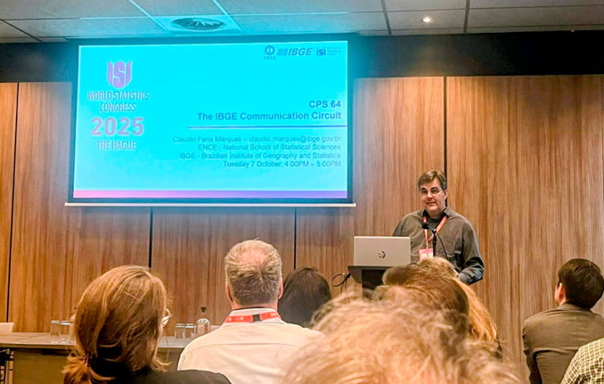 O jornalista e professor da ENCE, Claudio Marques, apresentou o artigo “The IBGE Communication Circuit” durante a sessão CPS 64 – Data Dissemination and User Engagement in Official Statistics, no congresso. O trabalho, baseado em um dos tópicos de sua tese de doutorado, propõe um modelo de circuito de comunicação para analisar como o IBGE dissemina suas informações estatísticas à sociedade.
