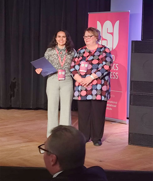 Além das apresentações, Bianca subiu ao palco para receber, em nome de dois estudantes brasileiros, o prêmio da etapa internacional da Competição de Pôsteres Estatísticos. Ela coordenou a competição no Brasil ao lado da professora Mauren Porciúncula, da FURG, atuando como coordenadoras nacionais no âmbito do Projeto Internacional de Letramento Estatístico (ISLP-IASE).