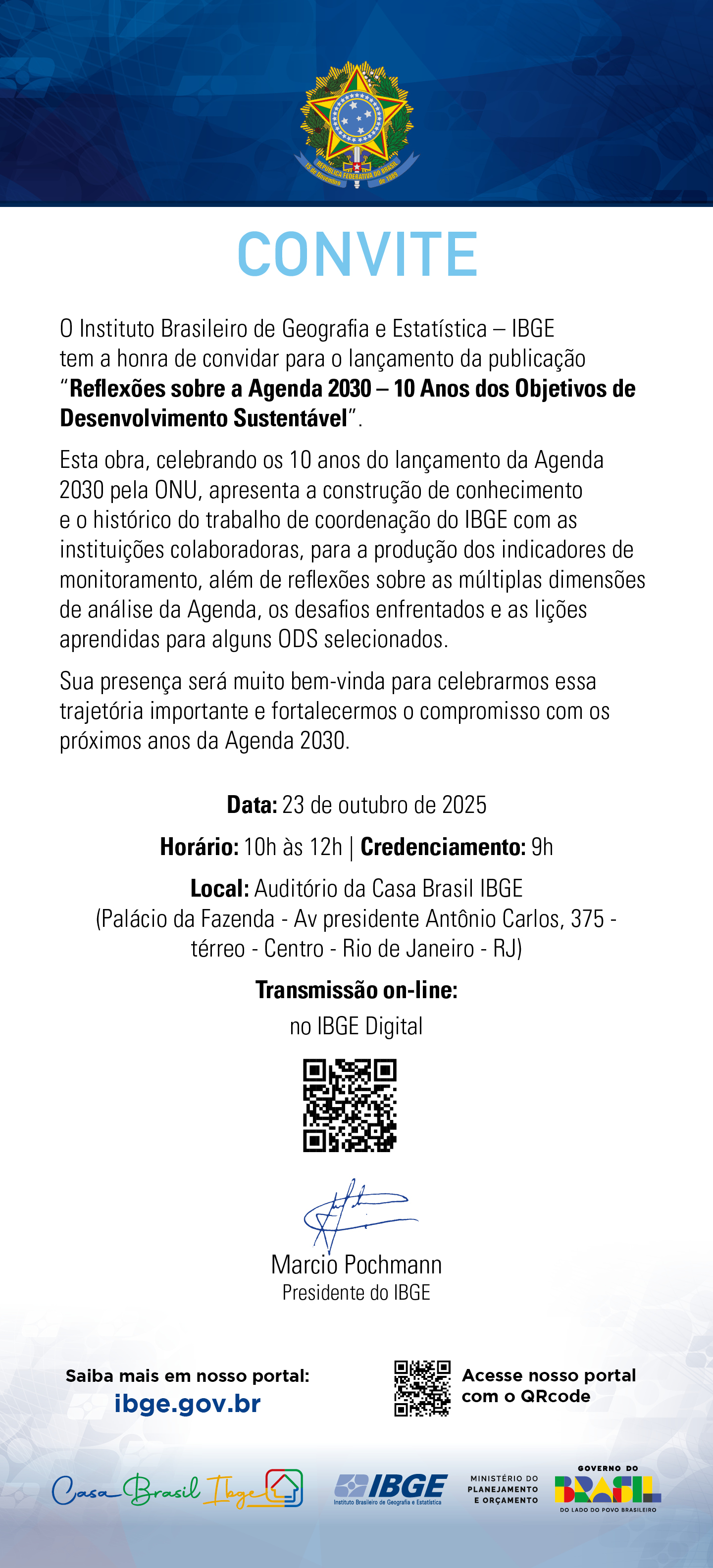 Local: Auditório da Casa Brasil IBGE (Palácio da Fazenda - Av. Presidente Antônio Carlos, 375 - Térreo - Centro - Rio de Janeiro/RJ)