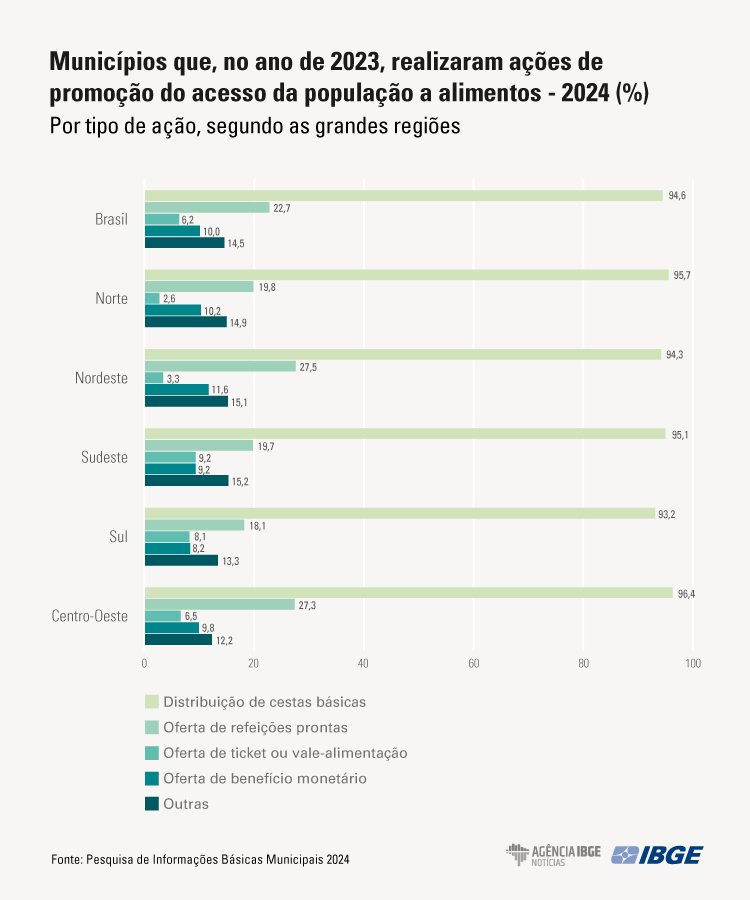 Entre os municípios, 78,7% (4.363) ofereceram o benefício. Região Norte e Sergipe foram os que declararam ter a maior proporção: respectivamente, 81,4% (359) e 93,3% (70). Com relação à modalidade do benefício, 95,3% (4.157) ofereceram cestas básicas, enquanto 11,5% (974) ofereceram benefício monetário.