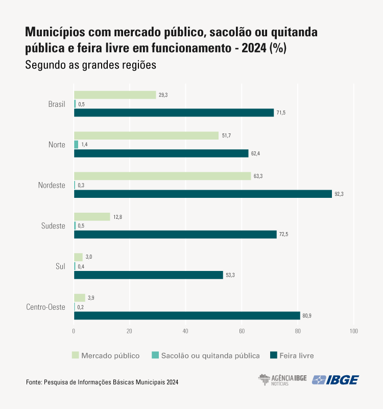 Em 2024, havia mercados públicos em 5 estados e em 1.624 (29,3%) municípios. Em apenas uma unidade da federação (São Paulo) havia sacolão ou quitanda pública, assim como em 27 municípios (0,5%). Entretanto, a presença de feiras livres chegou a 3.961 (71,5%) municípios, contabilizando 9.232 feiras em funcionamento. Dos 2.323 mercados públicos, a maioria (94,9%) era de responsabilidade exclusiva do município.