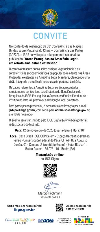 No contexto da realização da 30ª Conferência das Nações Unidas sobre Mudança do Clima (COP 30), o IBGE promove amanhã (12) evento de lançamento da publicação Áreas Protegidas na Amazônia Legal: um retrato ambiental e estatístico, na Casa Brasil IBGE Belém, no Pará. O evento contará com a participação online da equipe responsável pela publicação, Marta de Oliveira Antunes, gerente de Povos e Comunidades Tradicionais; André Pelech, gerente de Mapeamento de Recursos Naturais; e Fernando Souza Damasco, gerente técnico do Censo Demográfico. O evento terá ainda a presença do superintendente estadual do Pará, Rony Helder Nogueira Cordeiro, e representantes de outros órgãos públicos. Haverá transmissão ao vivo pelo IBGE Digital.