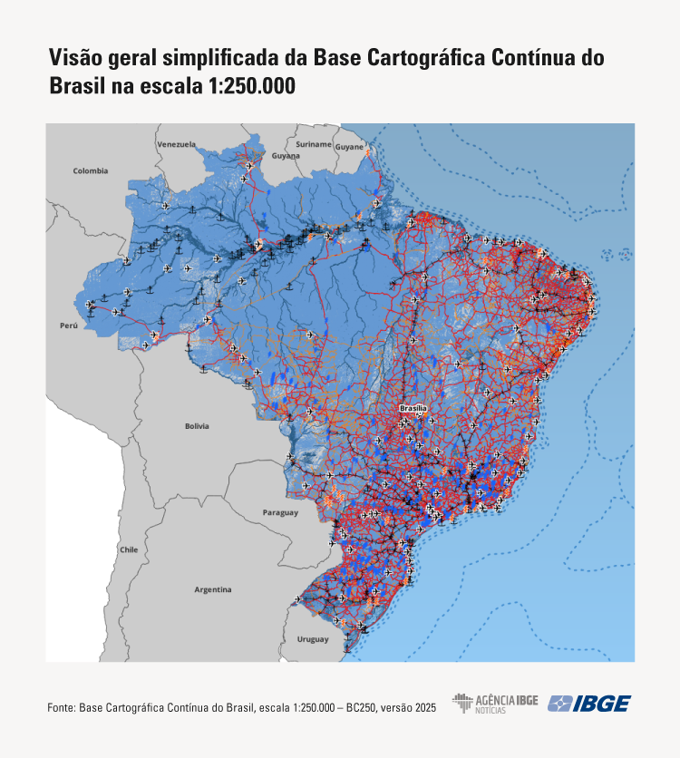 O IBGE lançou nesta quarta-feira (26) a sétima edição da Base Cartográfica Vetorial Contínua do Brasil, a BC250, atualizada a cada dois anos desde 2013. Produzida na escala 1:250 000, a base reúne informações essenciais para o planejamento, o monitoramento e a gestão do território nacional.