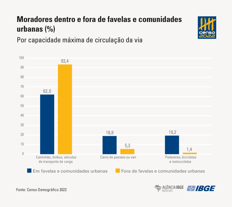 A pesquisa mostra também que 62,0% (10,0 milhões) dos moradores de favelas viviam em trechos de vias com capacidade máxima de circulação por caminhão, ônibus e veículos de transporte de carga, enquanto fora desses territórios, o percentual era de 93,4%. Já a proporção da população que morava em trechos de vias com capacidade máxima para carro ou van foi de 18,8% (3,0 milhões) em favelas e de 5,3% nas demais áreas da cidade.