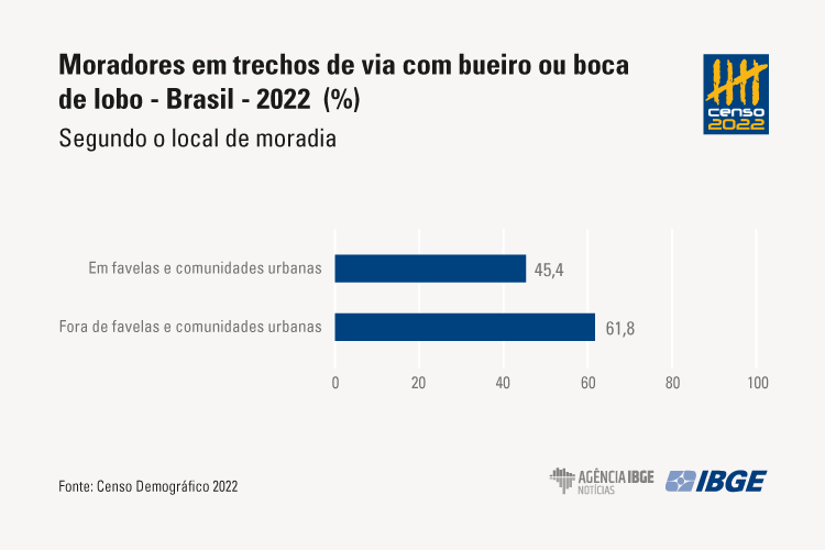 Menos da metade (45,4%) dos moradores de favelas viviam em trechos de vias com bueiro ou boca de lobo, totalizando 7,3 milhões de pessoas, enquanto 54,6% (8,8 milhões) viviam em trechos sem a presença dessa infraestrutura. Já nas áreas fora de favelas, a proporção sobe para 61,8% de habitantes que viviam em trechos de vias com esse equipamento.