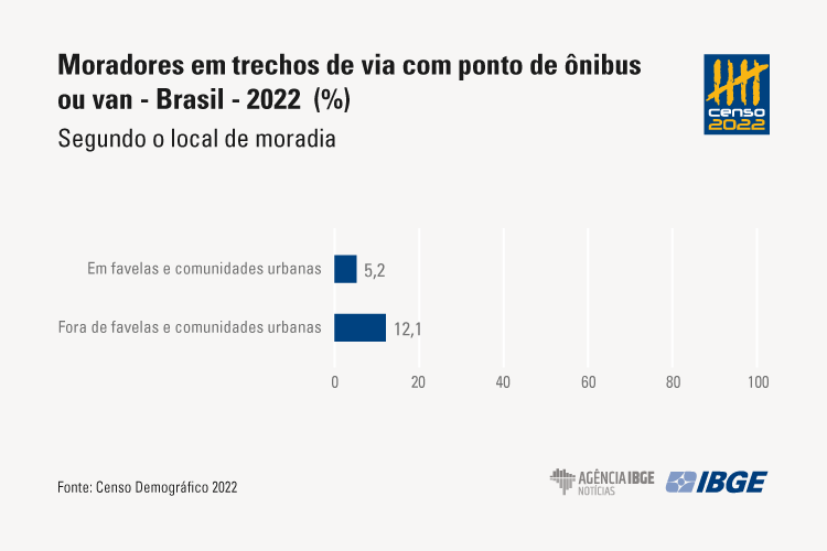 Apenas 5,2% (835.936 pessoas) dos moradores de favelas viviam em trechos de vias com ponto de ônibus ou van. Fora dessas áreas, a proporção de pessoas com disponibilidade dessa infraestrutura urbana no seu trecho de via era mais que o dobro (12,1%).