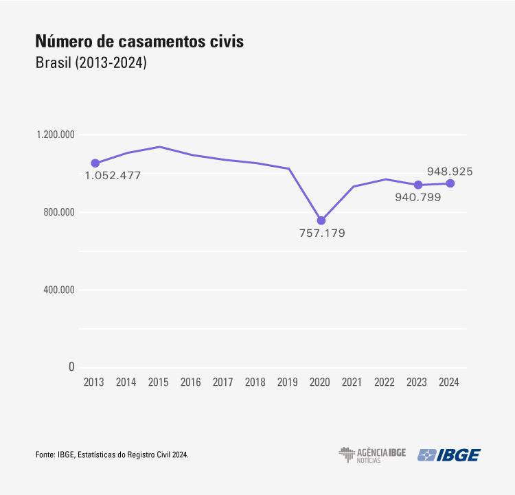 A partir de 2016, o número de casamentos civis apresentou tendência de queda. Com a pandemia da Covid-19, a redução foi ainda maior em relação ao ano anterior. Em 2021, as cerimônias matrimoniais voltaram a crescer, mas sem alcançar o número de 2019. O mesmo aconteceu em 2022. No ano seguinte, a quantidade de casamentos civis sofreu redução novamente. O ano de 2024 superou o de 2023, mas sem alcançar a média observada no período de 2015 a 2019.