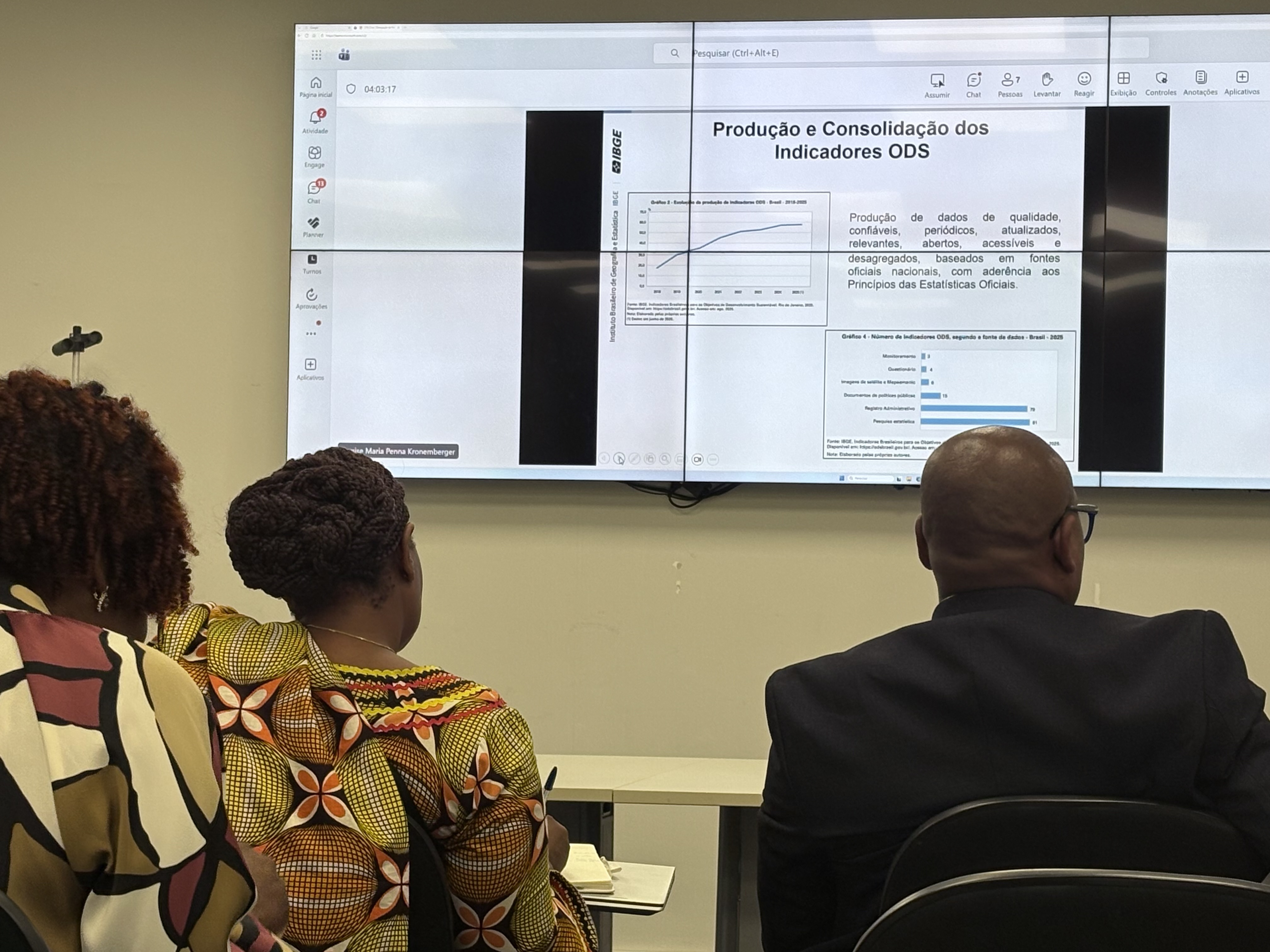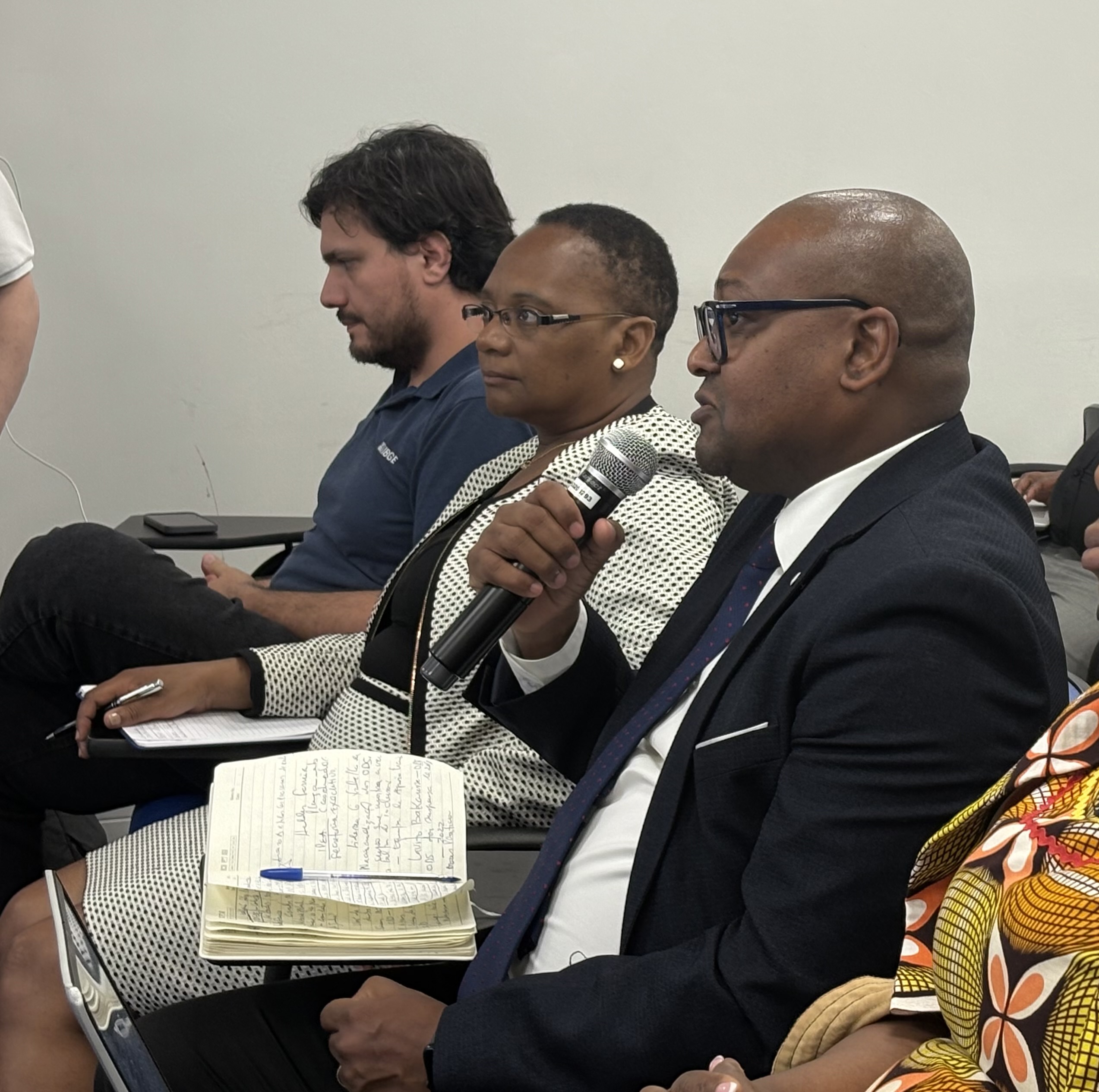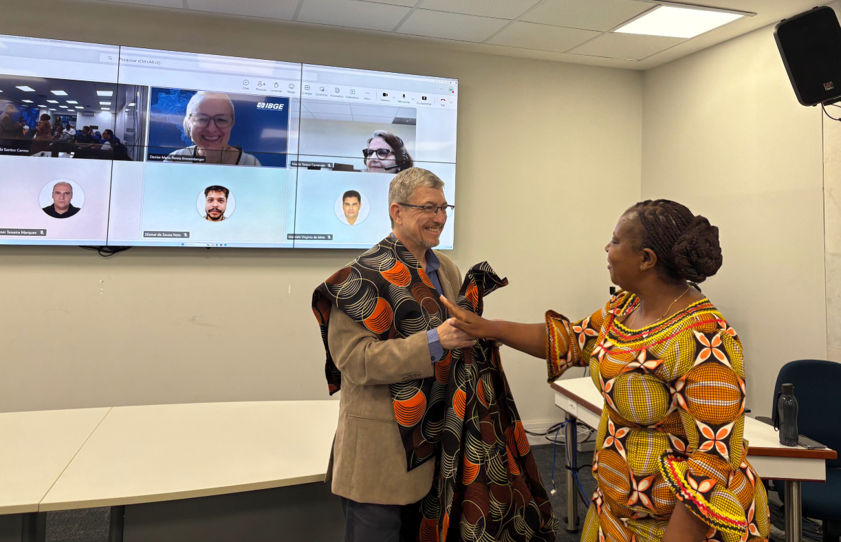 Após as apresentações, foi disponibilizado um momento para perguntas e respostas. A delegação moçambicana concentrou suas questões nas lições aprendidas pelo IBGE, nos processos de cooperação, governança, comunicação, capacitação e inovação, além da relevância dos dados para a formulação de políticas públicas e para a Agenda 2030. Um dos pontos de maior interesse foi a diferenciação dos papéis do IBGE e do Instituto de Pesquisa Econômica Aplicada (Ipea) no contexto dos ODS. Denise Kronemberger explicou que o IBGE atua principalmente na construção e no acompanhamento dos dados, enquanto o Ipea desenvolve análises de caráter mais avaliativo, voltadas às políticas públicas.