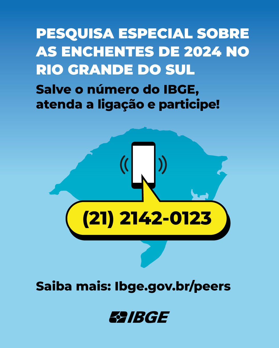 A Pesquisa Especial sobre as Enchentes de 2024 no Rio Grande do Sul (PEERS), lançada pelo IBGE em setembro de 2025, entrou na fase final de coleta. Até o dia 27 de fevereiro, moradores de cidades com baixo índice de resposta serão contatados por agentes do Instituto pelo telefone (21) 2142-0123.
