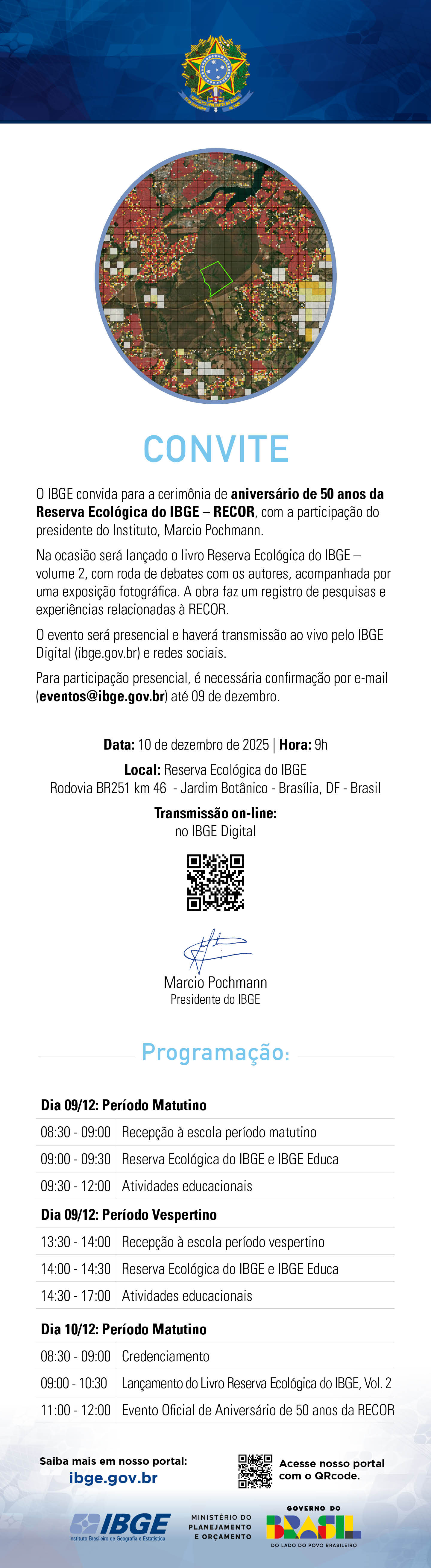 O presidente do IBGE, Márcio Pochmann, ressaltou a importância da Reserva, conhecida como RECOR, ao longo desses 50 anos: “A Reserva Ecológica do IBGE se consolida como um dos principais laboratórios vivos do Cerrado e referência nacional em conservação ambiental, pesquisa ecológica de longo prazo e monitoramento da biodiversidade. Ao integrar ciência, preservação e educação ambiental, fortalece a atuação do IBGE na produção de informações territoriais e ambientais essenciais para políticas públicas no Brasil".