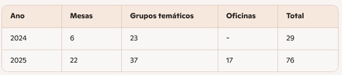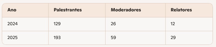 O esforço de levar o evento à Bahia simboliza a descentralização e a ampliação do debate nacional. A edição de 2025 conta, até o momento, com 76 atividades — 22 mesas, 37 grupos temáticos e 17 oficinas, que são novidade em relação à edição anterior. Já estão confirmados 193 palestrantes, 59 moderadores e 29 relatores, consolidando-se como a maior edição já realizada.