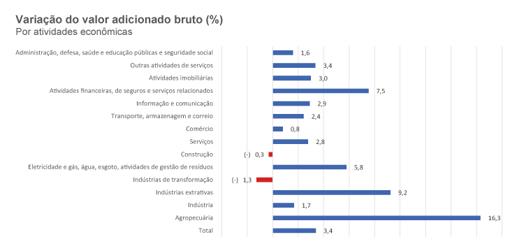 O valor adicionado bruto cresceu 3,4%. Em termos de impacto, 1,9 p.p se devem ao crescimento dos Serviços e 0,4 p.p ao crescimento da Indústria que juntos representam mais de 93% do indicador. Já a agropecuária cresceu 16,3% contribuindo positivamente com 1,1 p.p.