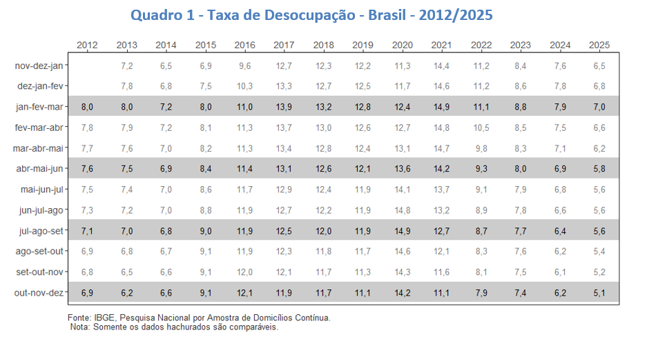 A taxa de desocupação (5,1%) no trimestre encerrado em dezembro de 2025 foi a menor da série histórica iniciada em 2012, recuando nas duas comparações: -0,5 ponto percentual (p.p.) frente ao trimestre móvel anterior (5,6%) e -1,1 p.p. ante o mesmo trimestre móvel de 2024 (6,2%).