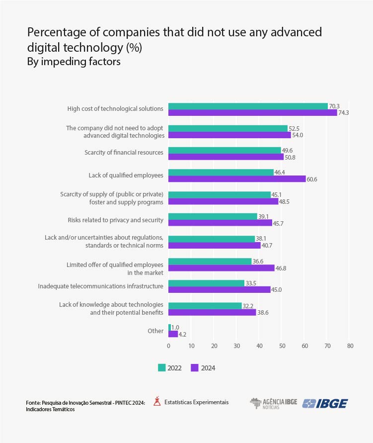 Of the companies with 100 or more employed persons, 10.9% did not adopt any of the digital technologies investigated in 2024. In this group, 95.2% reported some type of factor that, somehow, contributed to companies not to implement advanced digital technologies.