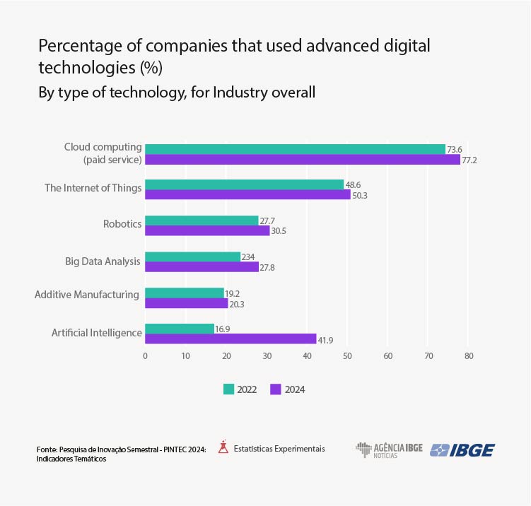 - In 2024, 41.9% of the companies surveyed used Artificial Intelligence. This technology did not record the highest utilization rate, but the biggest increase: 25 percentage points from 2022 (16.9%).
