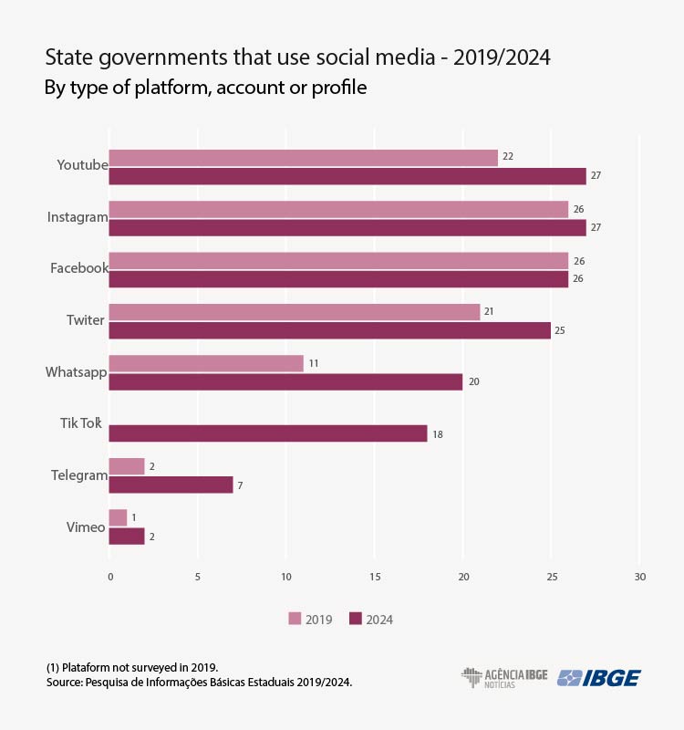 The most frequently used digital platforms were YouTube and Instagram, used by state governments in all the FUs, followed by 26 states, except for Acre. Between 2019 and 2024, the number of Federation Units that had a WhatsApp account increased from 11 to 20. Tik Tok, surveyed for the first time, was found in 18 states in 2024. The use of these platforms for public consultations or enquiries also increased among the UFs, with a change from 7 in 2019 to 18 in 2024. Almost all the state governments (24) updated the content of platforms daily, except for Piauí and Goiás, which updated theirs at least once a week. Pernambuco did not provide information of periodicity.
