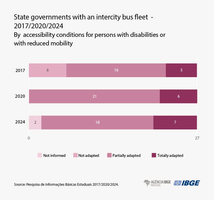 Intercity public bus transportation was offered in all the 25 Federation Units that answered the survey on this topic. The exceptions are Rondônia, which did not provide information, and Amazonas. Of these 25 FUs, 7 had bus fleets fully adapted for persons with disabilities or reduced mobility, a slightly better result than in 2020 (6) and 2017 (5). Eighteen states had partially adapted fleets. In 2020, there were no states with non-adapted fleets.