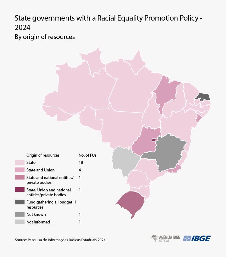 The state budget included the Racial Equality Promotion Policy for 2024 in eight Federation Units (Amapá, Rio Grande do Norte, Pernambuco, Alagoas, Espírito Santo, Paraná, Mato Grosso and Distrito Federal). However, none of them executed 100% of the expected budget.