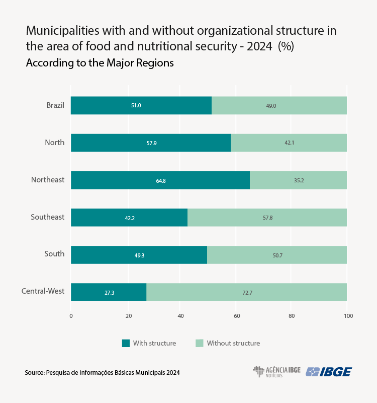- Almost half of the Brazilian municipalities (49%) did not have any organizational structure that dealt with food and nutritional security policy in 2024.