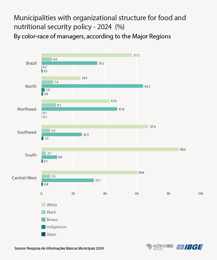 - Less than half of the people who headed the food and nutritional security department were of brown, black, Indigenous or Asian color or race; 57.2% of the municipal bodies in the area were managed by white people.