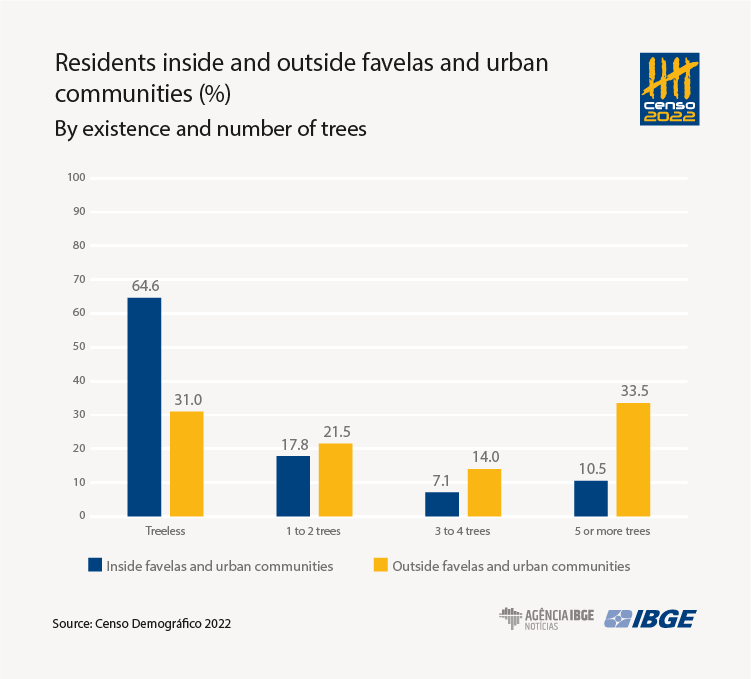 In the Brazilian favelas and urban communities, 64.6% of residents (10.4 million people) lived on stretches of roads without trees, while 35.4% (5.7 million people) lived on stretches of roads with trees. In places outside favelas and urban communities, 69.0% of residents lived on stretches of roads with trees. The difference is also large when analyzing stretches with 5 trees or more: 10.5% of residents of favelas and urban communities lived on roads with such afforestation, while 33.5% of residents outside favelas and urban communities lived in environments with this feature.
