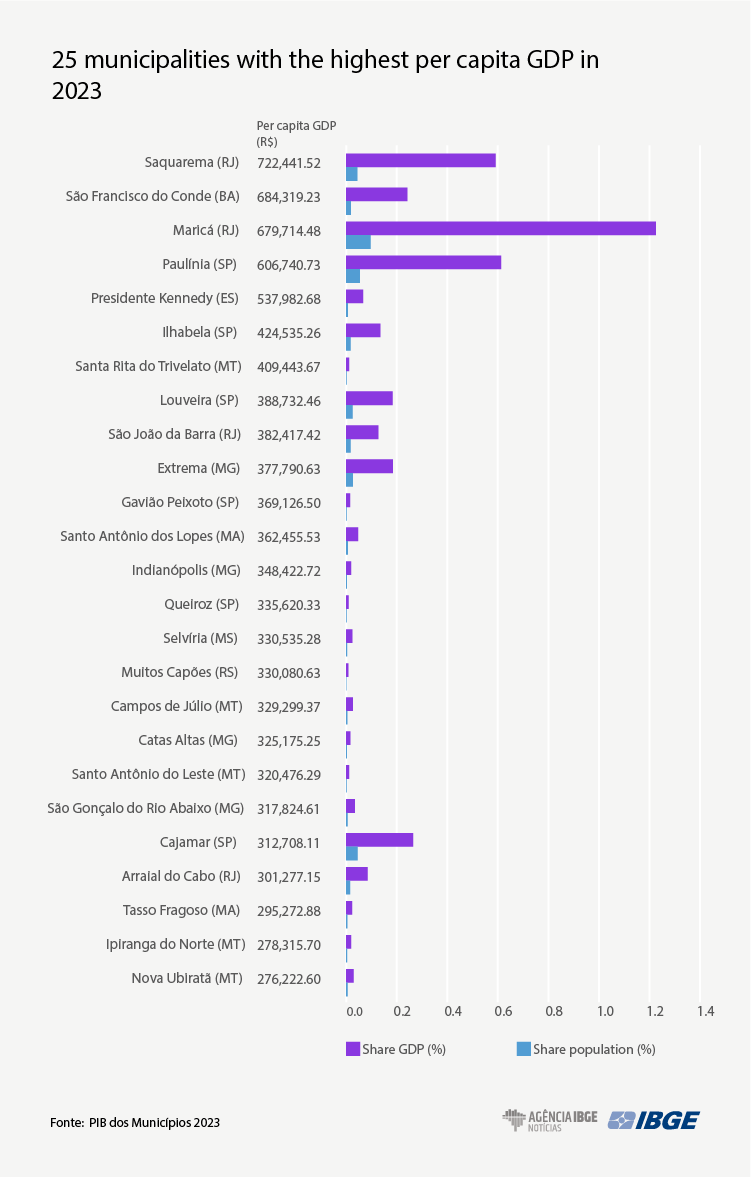 - In the group of five municipalities with the most intense losses in share in the national GDP between 2022 and 2023, all had an economy related to oil exploration: Maricá (RJ), with a drop of 0.3 percentage points (p.p.), followed by Niterói (RJ) and Saquarema (RJ), with -0.2 p.p. each. Ilhabela (SP) and Campos dos Goytacazes (RJ) complete the list, both with -0.1 p.p.